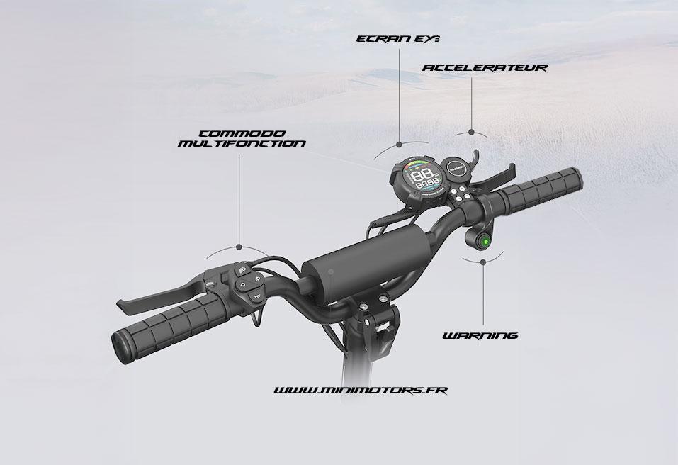 La Rovoron R7 est conçue pour vous. Vous serez parfaitement à l'aise sur cette trottinette électrique tout terrain. Depuis le guidon, vous aurez accès à l'écran EY3 connecté (via l'application Dualtron), vous pourrez donc avoir toutes les infos de la trottinette à portée de main. Cet écran intègre aussi l'accélérateur, une gâchette simple et précise pour maîtriser totalement la gestion de votre accélération.