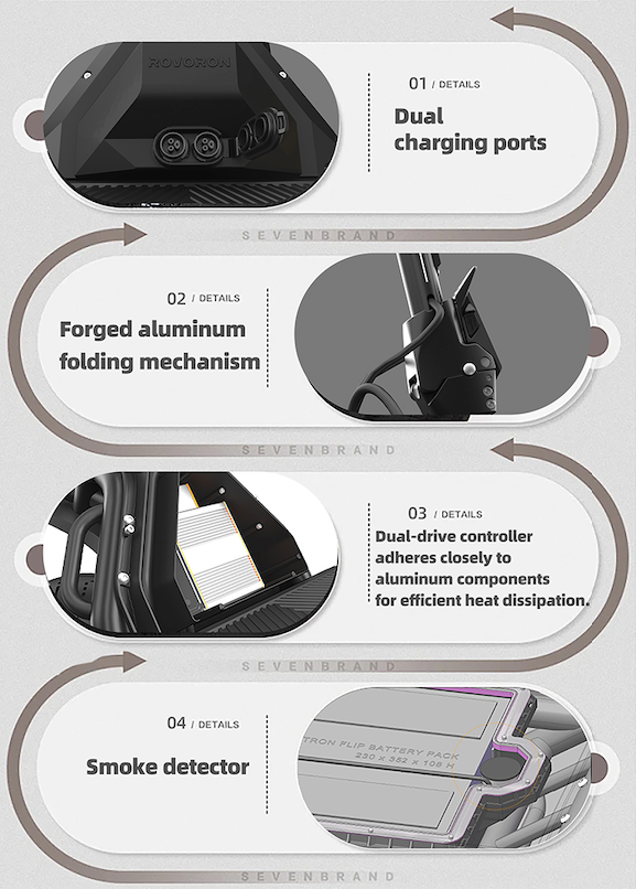 La Rovoron R7 apporte de nouvelles fonctionnalités sur le marché de la trottinette électrique haut de gamme. Vous trouverez par exemple un détecteur de fumée à l'intérieur du compartiment batterie de la trottinette. Ainsi, au moindre risque d'incendie, vous serez automatiquement prévenu via une alarme sonore. Pour prévenir de ce type d'incident, cette R7 est équipée de systèmes de refroidissement, notamment pour le contrôleur électrique Rovoron.